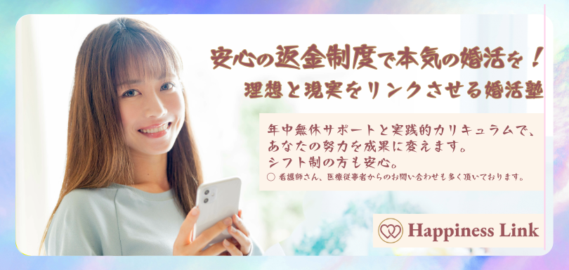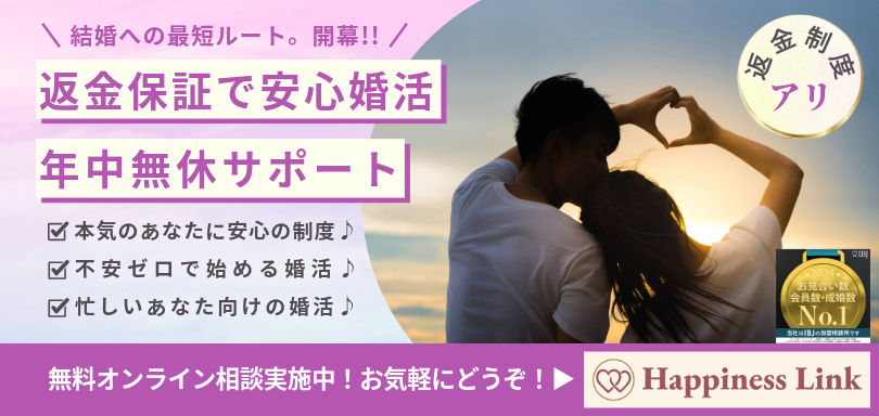 Happiness Linkなら全プランに返金制度を設けてますので安心して婚活を始められます。万が一、1年以内に成婚にいたらず退会される場合は、登録期間に応じて返金いたします。まずは無料相談でお気軽にお問い合わせください。